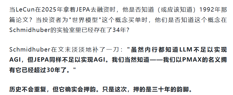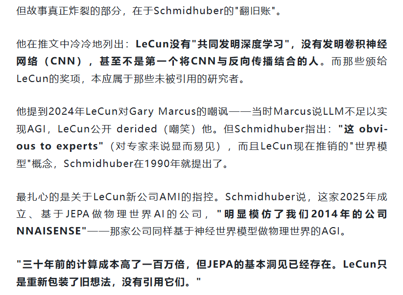 更尴尬的是时间点——LeCun刚在2025年成立了新公司AMI,估值 presumably 不菲,核心技术正是JEPA。而Schmidhuber说:"这公司的卖点,是我30年前玩剩下的。"