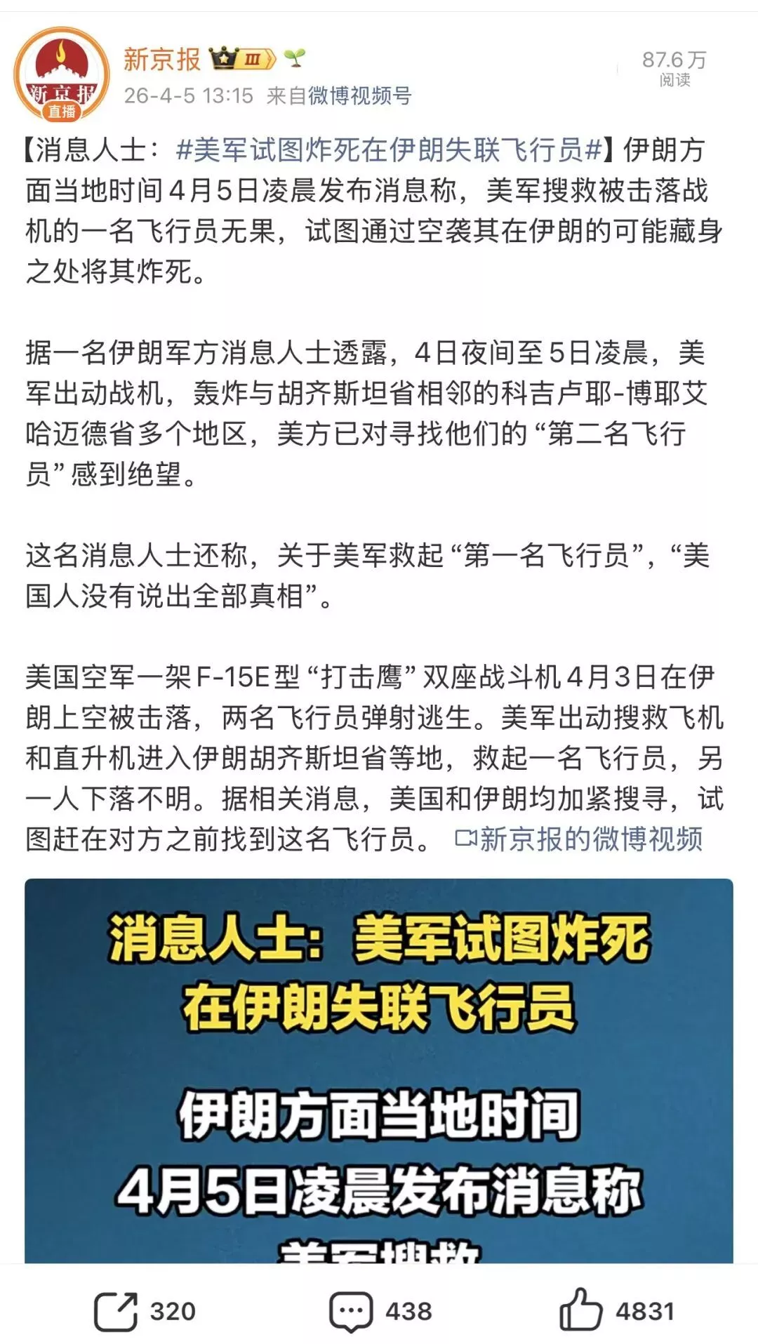 比如有媒体就报道了,美军试图炸死在伊朗失联的飞行员。甚至暗示要灭口吗?