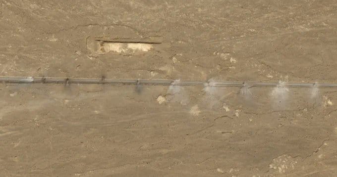卫星影像显示道路出现约28个大型弹坑,呈直线排列以切断地面通行路线。(X截图)