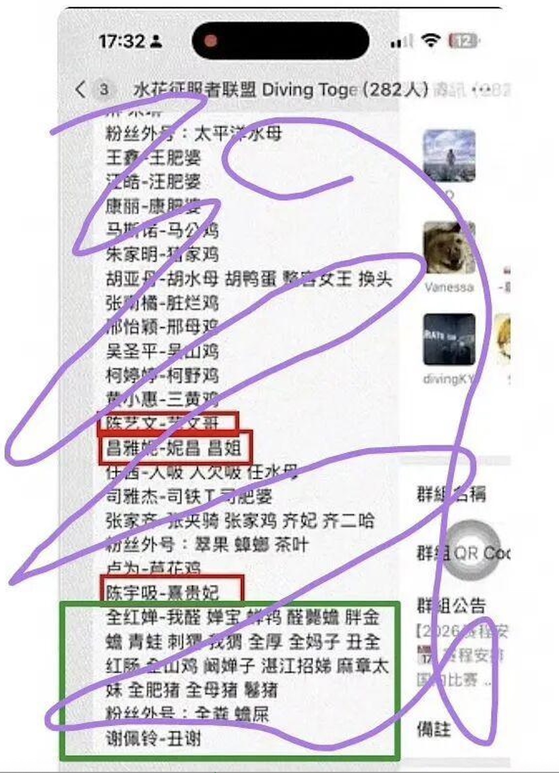 被曝光的群成员包括了多位跳水运动员,如陈芋汐、昌雅妮、陈艺文、胡亚丹、龙道一、杨健,运动员家属练俊杰爸爸,央视记者杨烁,跳水国际裁判饶琅,还有几个跳水博主,还有一些人员身分没有被曝光。
