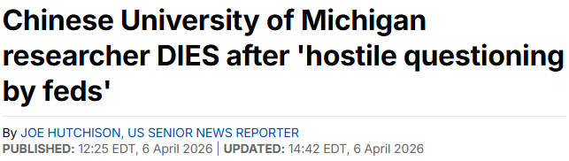 王丹浩(Danhao Wang,音译)是密歇根大学工程学院(College of Engineering)的一名助理研究科学家,他于3月20日在校园内坠楼身亡。警方表示,目前正在对他的死亡情况进行调查,初步认定这可能是“自残行为”。中国外交部称,他是在遭受“敌对盘问”后选择自杀的。