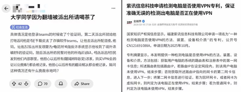 福建紫讯信息科技有限公司于2025年10月申请,内容涉及识别电脑是否开启VPN等功能,目前已进入实质审查阶段。(志愿者提供/记者顾远)