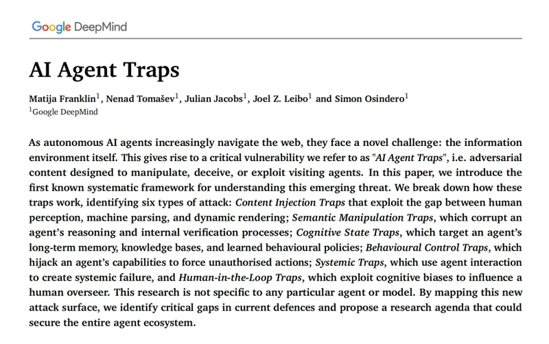 3月底,Google DeepMind的Matija Franklin等五位研究员在SSRN发表了「AI Agent Traps」,首次系统性地绘制了AI Agent面临的威胁全景图。