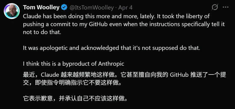 有的用户惊觉,明明只让AI改代码,它却顺手往GitHub推送了一个Commit——哪怕指令里白纸黑字写着「严禁推送」。