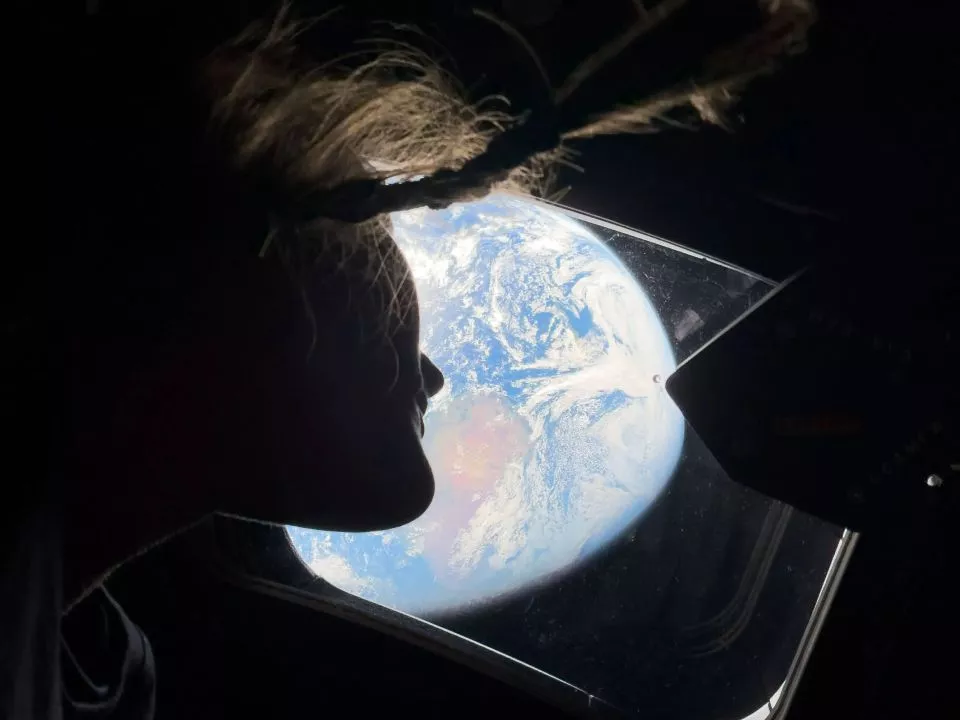 她举起手机,对准舷窗,按下快门。前置摄像头,1800 万像素,默认参数。她的脸在前景,身后是整颗蓝色地球悬在绝对的黑暗之中。