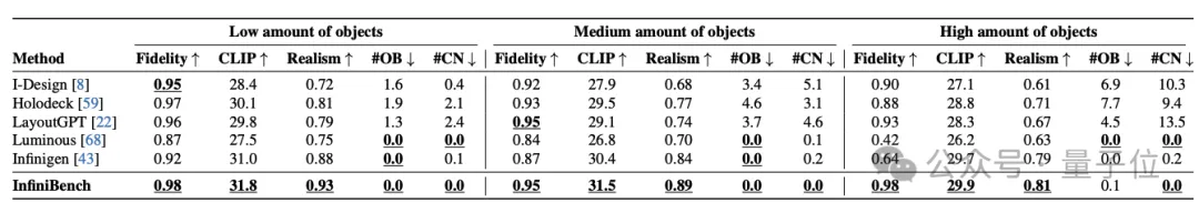 而InfiniBench不仅提示词契合度比肩顶尖LLM方法,更在物理合理性上达到了近乎完美的水平(碰撞数量和越界物体数量均无限逼近于0.0)。