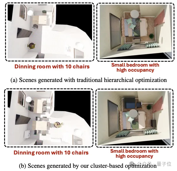 这是InfiniBench超越传统3D生成引擎的核心亮点。当场景复杂度(物体数量、空间占用率)急剧攀升时,传统的“层级优化策略(Hierarchical optimization)”往往会陷入死胡同——它们习惯先固定大物件(如桌子),结果发现剩下的小物件(如椅子)根本塞不进去了。