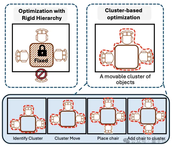 1. 识别簇:系统自动解析场景的语义图,将关系紧密的物体(例如:一张餐桌和它周围的一圈椅子)打包成一个“大块头(父子对象群体)”。