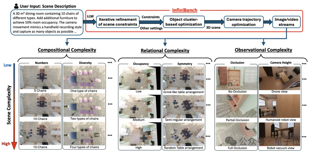 InfiniBench不生产固定且僵化的数据集,而是提供了一个全自动的基准生成引擎。你只需要告诉它:“生成一个30平米的餐厅,里面有10把不同类型的椅子,再加点家具让空间占用率达到50%”,它就能自动进行布局规划、物理校验,并最终渲染出一镜到底的视频。