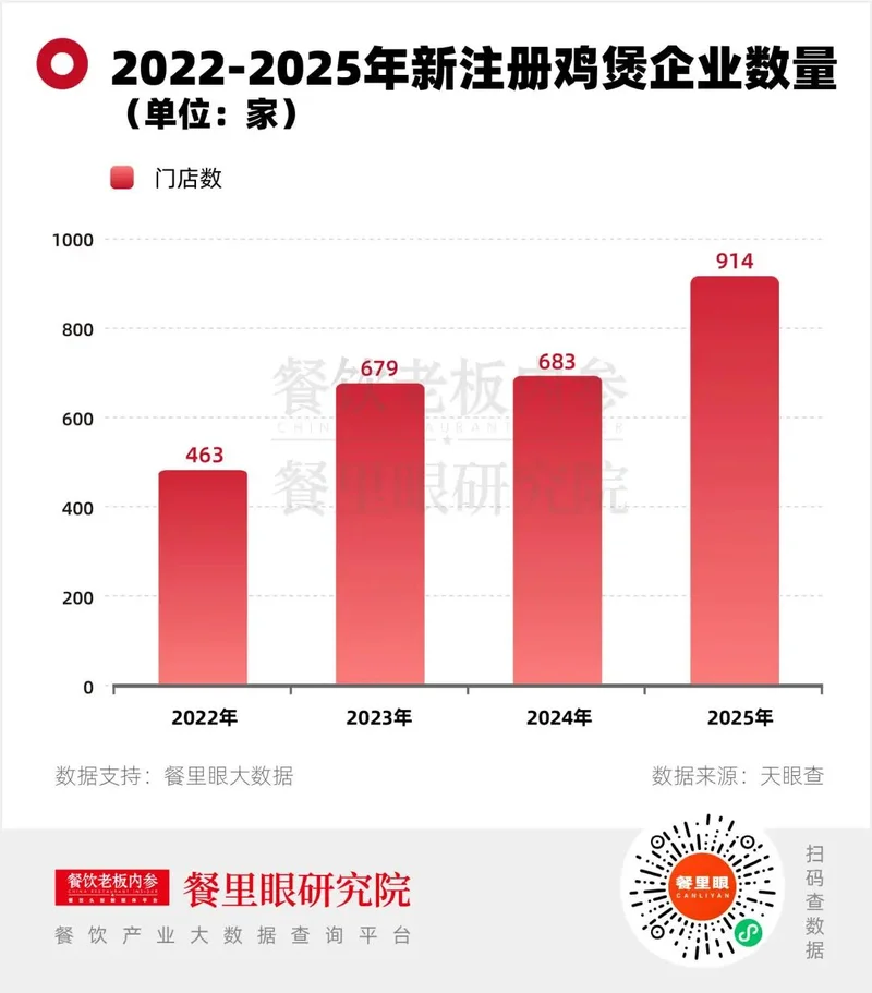 截至2026年3月,名称含“鸡煲”的在营餐饮企业达4881家,绝大多数为近三年新增。2022—2025年,新注册鸡煲相关企业连续四年稳步增长,从2022年463家一路攀升至2025年914家,赛道扩容趋势明显。