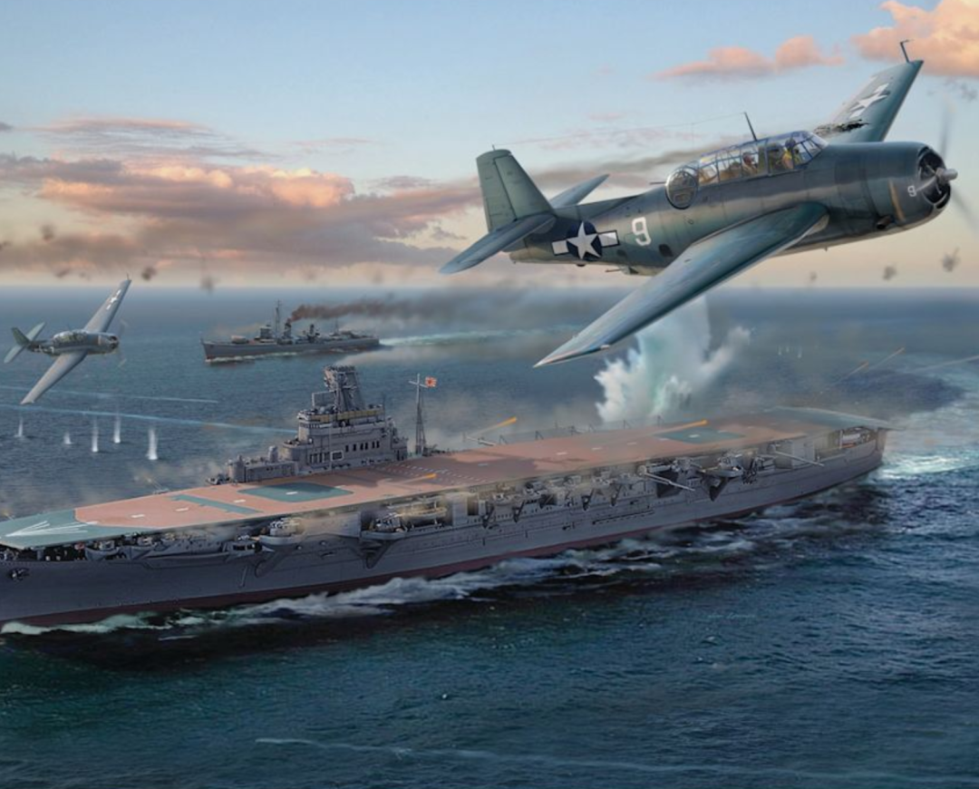 约克城号(CV-10),长265.8米,宽45.0米,最高速度33节,满载36380吨,可搭载90架战机。