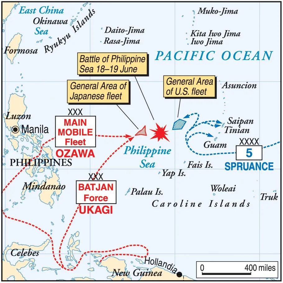 中途岛海战和瓜达尔卡纳尔岛战役后,美日集中所有可用航空母舰,在菲律宾海东部、马里亚纳群岛以西海域,进行海上大决战,即菲律宾海海战。