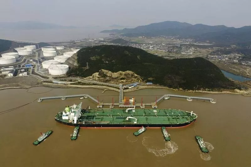 一艘载有伊朗原油的油轮停靠于中国舟山港。外媒分析指出,中国对伊朗石油的大规模采购,已成为德黑兰每年获取战事资金的主要管道。(美联社资料照)
