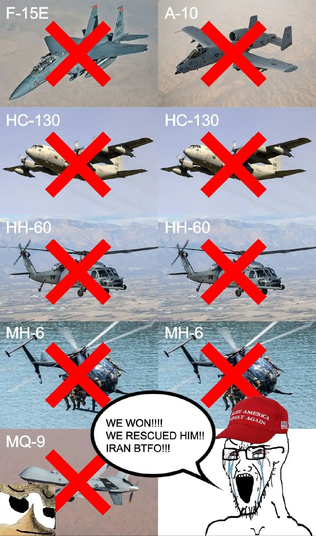 所以,目前我倒是更相信伊朗的说法,因为伊朗好歹放出来现场美军飞机被摧毁的视频,细节充分,有图有真相……而美军方面呢?只有小作文,救出的飞行员根本没看到,按照美国人宣传的尿性,如果真的成功营救了,这会儿各种照片、视频、访谈早就满天飞了,以他们的演员体质,以他们对赢学的热衷,能不把它当做一场巨大的“秀”去展示吗?