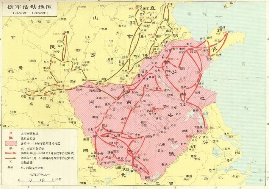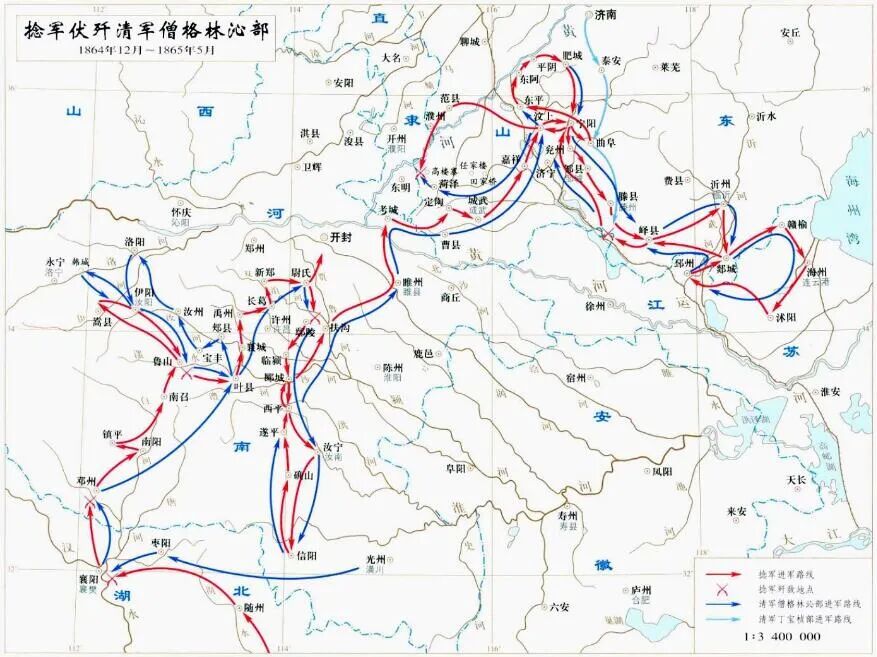 1865年,太平天国残部在赖文光的率领下同捻军合流,继续在北方流窜。不过这次捻军想要玩一把大的,给僧格林沁来一次“斩首行动”。他们不断地引诱僧格林沁部来回机动,今天到河南,明天到湖北,后天到山东,仿佛遛狗一般地遛僧格林沁。