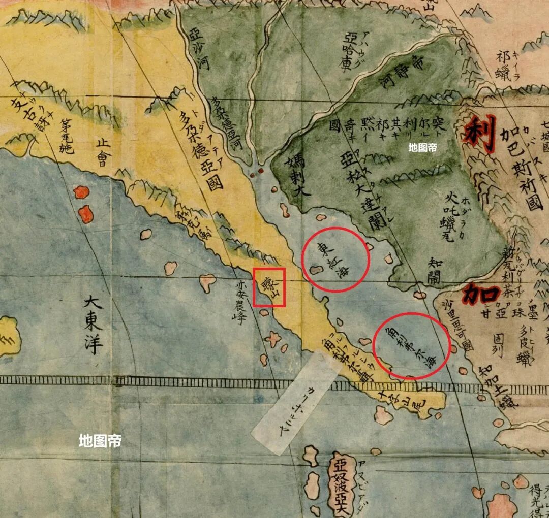 明朝世界地图《坤舆万国全图》上,有两个红海,西红海在我们西方,即今红海,东红海在我们东方,即今北美加利福尼亚湾北半部。