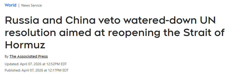 联合国消息,周二,俄罗斯与中国在联合国安理会否决了一项旨在重开霍尔木兹海峡的决议草案。此前,为争取俄中弃权,该提案内容已多次被削弱。