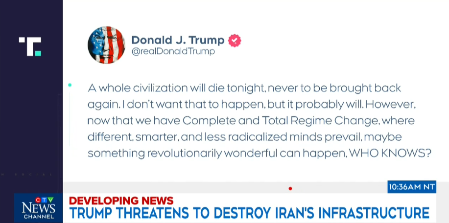 特朗普周二再度警告,如果德黑兰不接受包括重开霍尔木兹海峡在内的协议,称"整个文明今晚都将毁灭"。