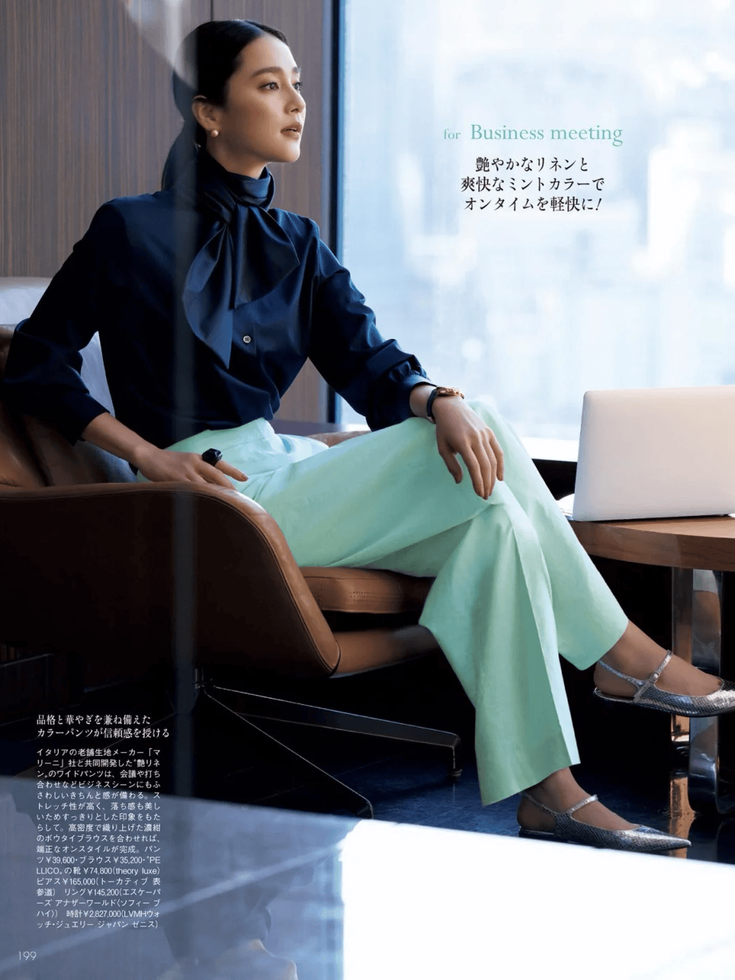 不必担心它的场合适配度不高,搭配白色西装外套或上衣,一样可以很智性干练,甚至一改往日黑白灰的沉闷,给人眼前一亮的美。