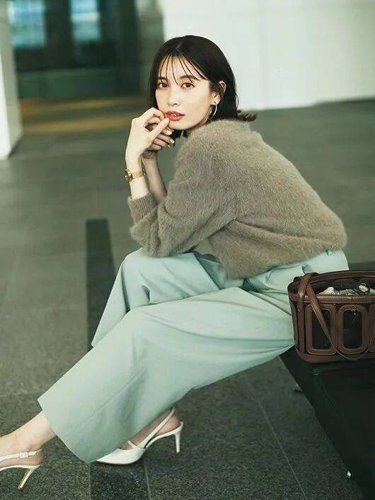 所以,当你决定pick同色系的搭配时,不妨试试有轮廓空气感或垂坠面料的阔腿裤(泡泡裤甜美、拖地阔腿裤显气场),时髦得毫不费力。