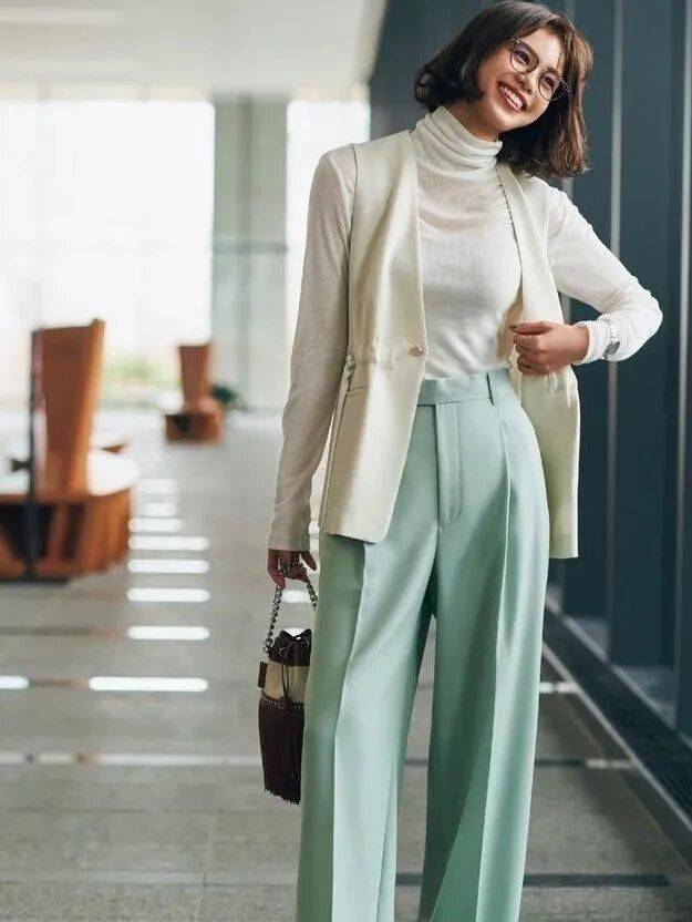 鼠尾草绿的阔腿裤,自带冷静气,保留了一点点蓝色的冷静和黄色的微暖,安静、克制、也很有分寸感。