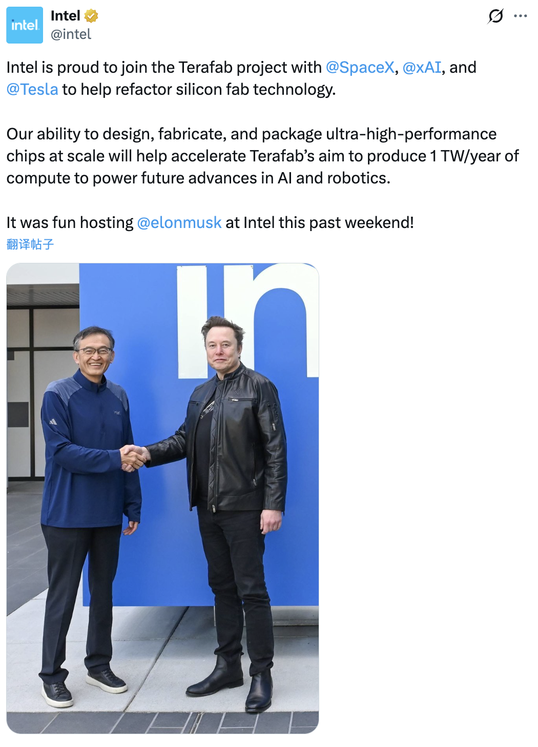 英特尔周二在马斯克旗下社交媒体平台X.com上宣布上述合作,并披露将与SpaceX、特斯拉及马斯克人工智能公司xAI展开合作。