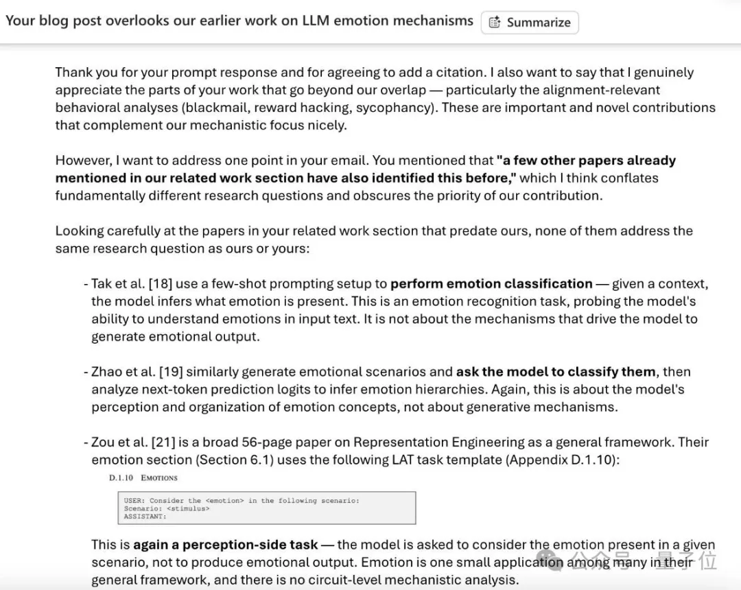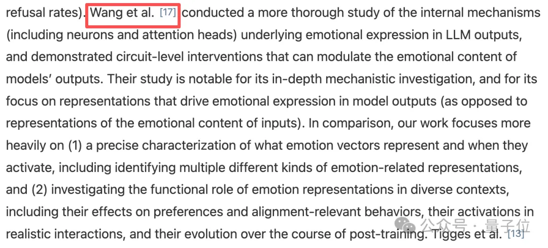 Chenxi Wang认为,两篇论文都研究了LLM自身产生的情感,而不是LLM在他人文本中感知到的情感,但Anthropic并未引用他们的研究成果。