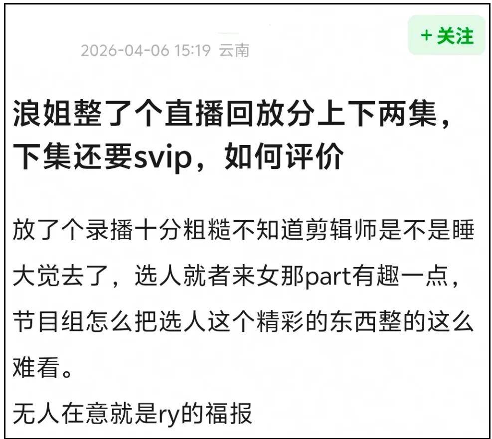 除了不直播,网友还觉得《浪姐7》越来越敷衍,观众花了钱呢,却要看剪辑粗糙的录播,连个字幕都没有。
