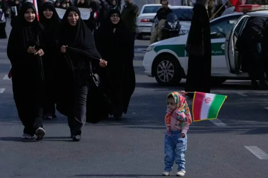 一名女童7日在伊朗首都德黑兰街上举国旗,纪念2月底遭空袭杀害的南部学校学童。美联社