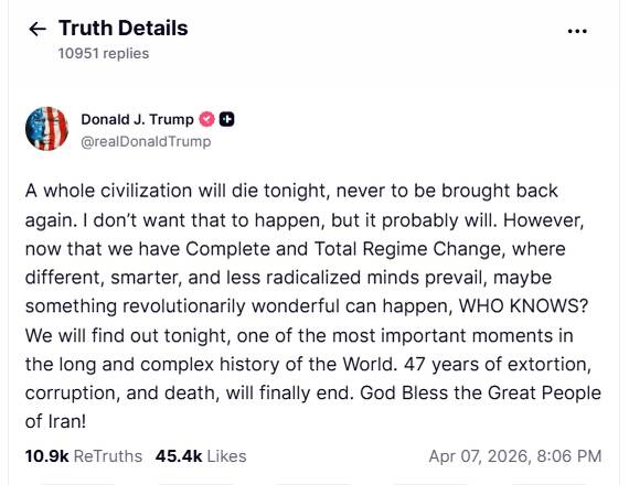 川普在美东时间7日晚间8时期限前,于社群平台「真实社群」(Truth Social)贴文「一整个文明将于今晚毁灭,永远无法复原。不想看到这件事发生,但很可能发生。」伊朗官方早前呼吁全国1400万青年组成人链,守护光明。