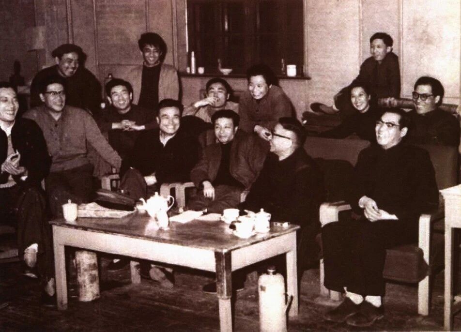 1957年,排练期间,老舍(前排右二)、焦菊隐(前排右一)与剧组人员在一起