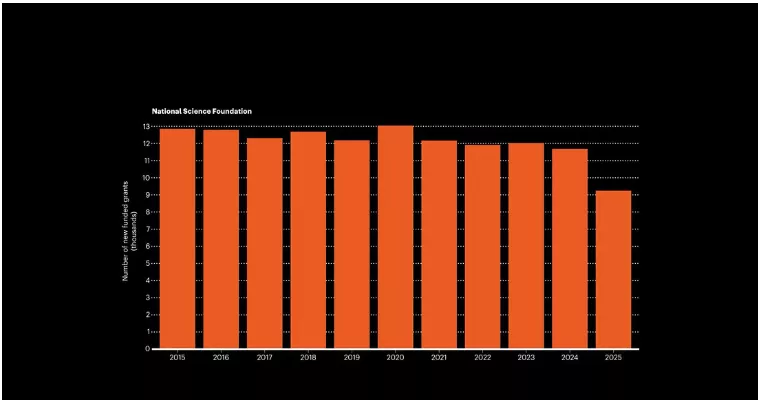 此外,特朗普任命的官员已经通过大幅降低科研资助的审批速度来扼制科学发展 。 例如,美国国家科学基金会批准的新资助数量如下: