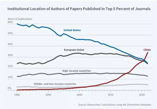 下方图表基于美国国家经济研究局最新报告,通过高水平期刊论文占比来衡量各国科研实力 。 上世纪 90 年代,美国在这类论文数量上超过世界其他国家总和 。 此后,美国已经滑落到第三位 —— 远远落后于中国,略低于欧盟 。
