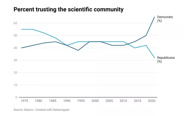 虽然我没有找到很好的调查数据,但很明显,这种反科学转向在共和党政治精英中更加明显,而且出现得更早 。