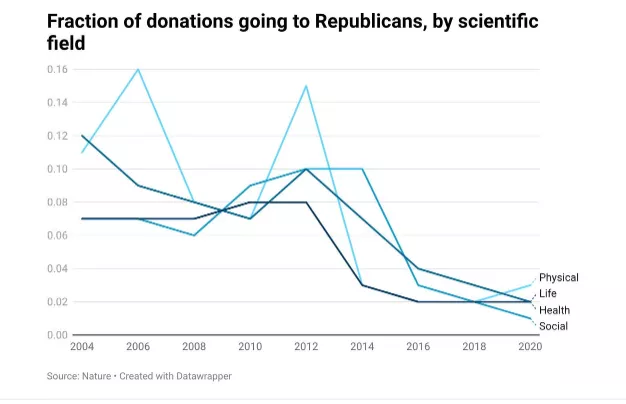 一项关于科学家政治捐款的研究显示,即使在 20 年前,只有很小比例的科学家向共和党捐款,而如今几乎没有科学家向共和党捐款 。