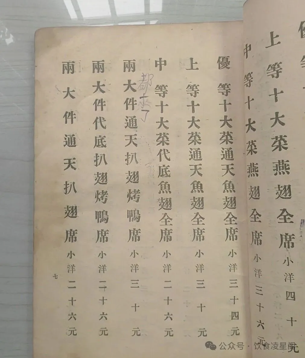 还有‘上等十大菜燕翅全席’和‘三等十大菜燕翅全席’都是三十六元,同一个价格,三个档次?是印错了,还是当年的定价就是这么随意?”