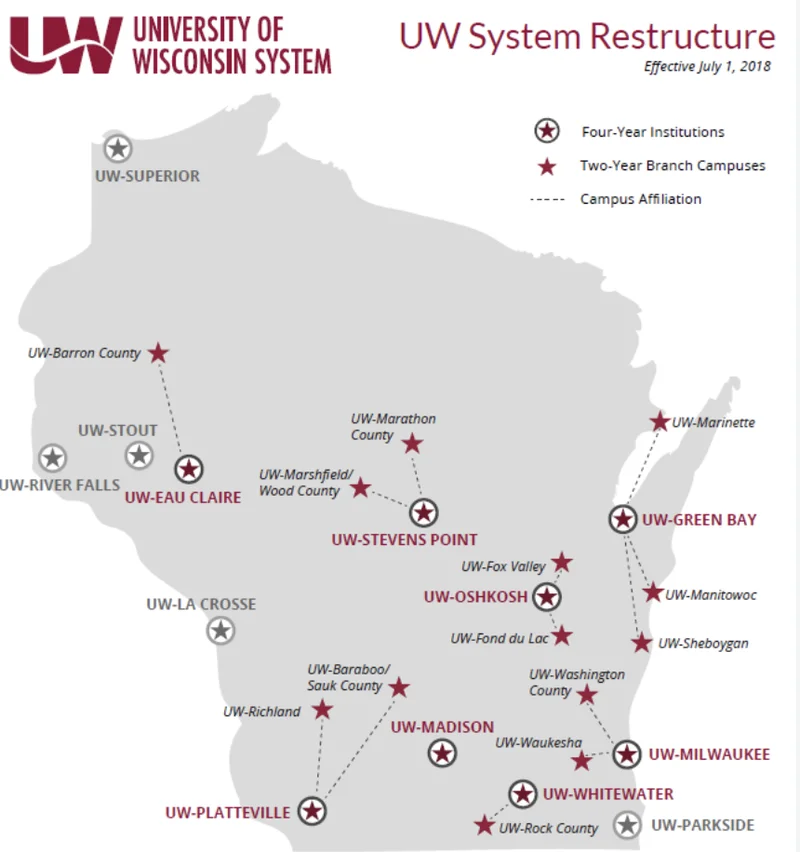 威斯康星大学系统(Universities of Wisconsin),可不是单指麦迪逊那一所母校哦。它是一个巨无霸级的公立大学系统,旗下有13所大学、25个分校区,总共养活(bushi)16.5万名学生和3.5万名教职员工。每年给威斯康星州输送3.7万个毕业生,是名副其实的“中西部人才工厂”。