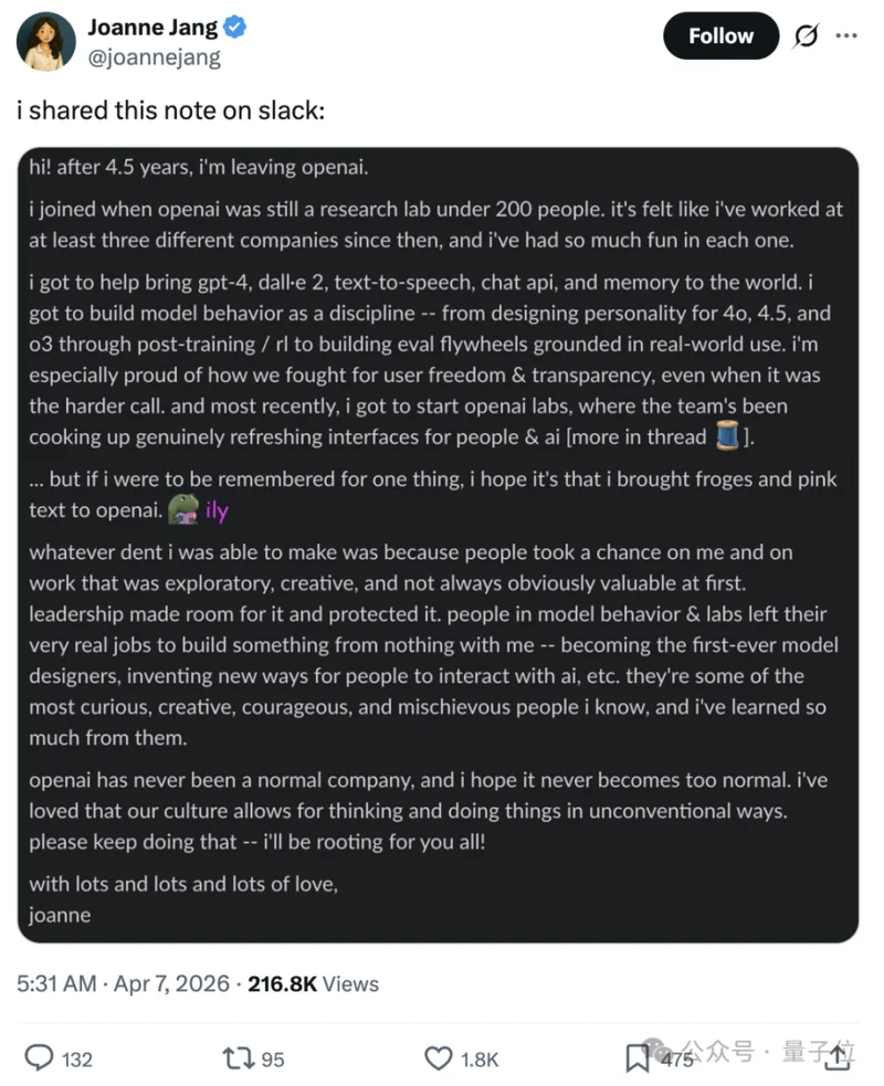刚刚,「4o之母」Joanne Jang发了一篇长文,宣布结束自己在OpenAI四年半的旅程。