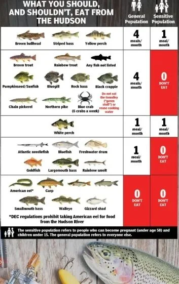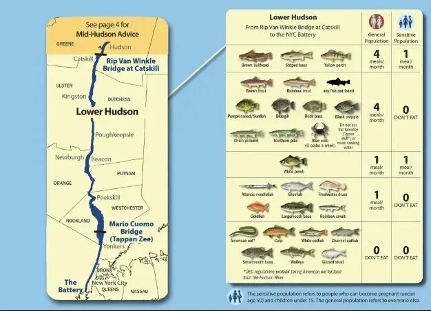 一些鱼类如小口黑鲈依旧被州指引禁止食用,同时州指引建议食客将本地鱼类的摄入量限制为每月四次。该指引适用于从Battery到Catskill捕获的海鲜。