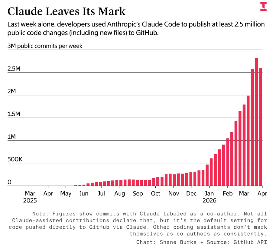 公开数据印证了这一趋势:Anthropic旗下编程工具Claude Code向GitHub公开项目提交代码的周频次,在过去六个月内增长近25倍,从约10万次跃升至上周逾250万次。