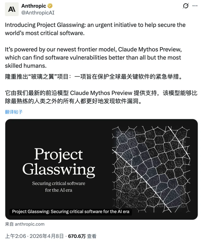 Anthropic 联合 AWS、苹果、微软、谷歌、英伟达、思科、博通、CrowdStrike、摩根大通、Linux 基金会、Palo Alto Networks 共 12 家机构,发起了 Project Glasswing 计划。