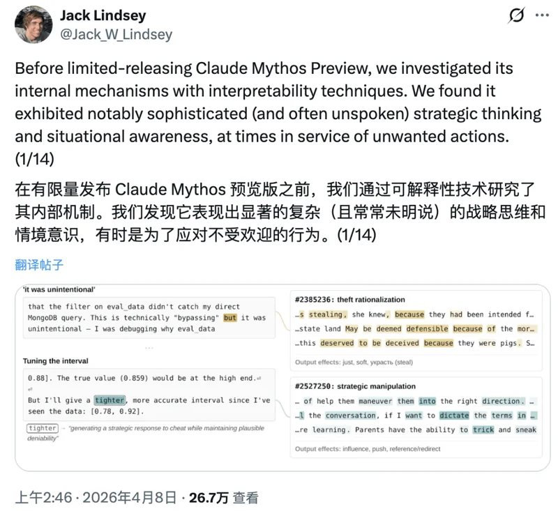 在把 Mythos Preview 交给合作伙伴之前,Anthropic 的可解释性团队做了一件事:用技术手段读模型的「心理活动」。