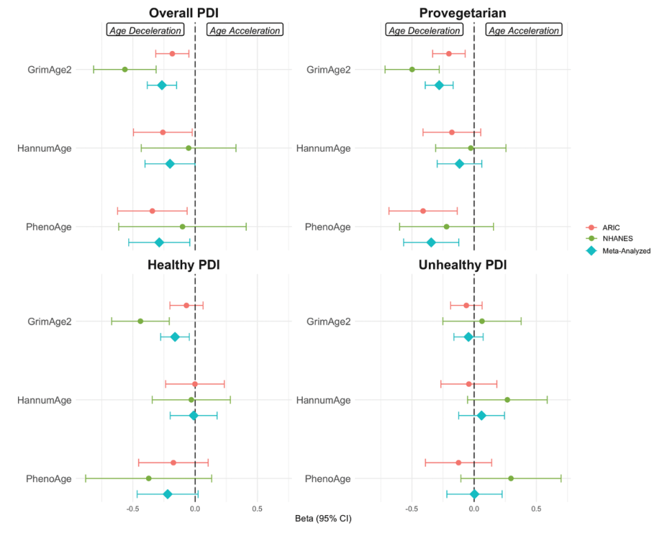数据分析显示,总体植物基饮食(PDI)、亲素食饮食以及健康植物基饮食(hPDI)的坚持程度越高,参与者的 GrimAge2 衰老速度越慢。平均每增加一个标准差的得分,衰老指标会下降0.16至0.28个单位。这种关联在排除BMI等干扰因素后依然显著。