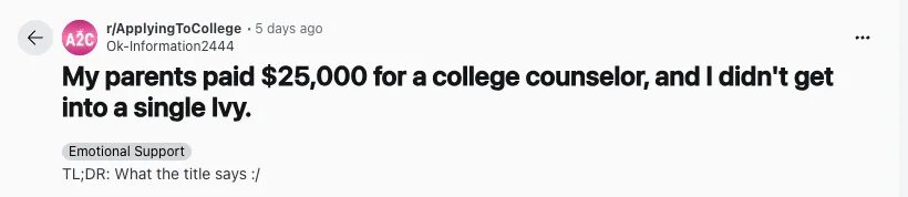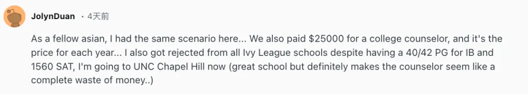 另一位申请到斯坦福和麻省理工学院等校的家庭花了20万刀;另一位亚裔网友表示,自己每年都花2.5w美金给顾问,持续了好几年。