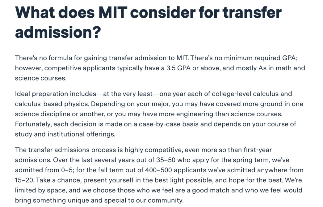 很多学校会在官网中明确指出这一点。比如麻省理工学院春季学期只有0到5个名额,秋季可能会招15到20人。