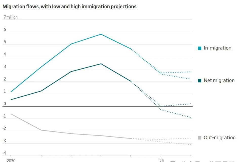 据布鲁金斯学会的计算,美国在2025年经历了净移民的负增长----预计约15万人迁出了美国----而且2026年人口外流可能会加剧。布鲁金斯学会的分析师指出,由于美国官方数据尚未完全反映人口外流的情况,实际的人口变动数据还需要核准。不过,从官方公布的数据来看,2025年美国总移民人数约为260万至270万,这远远低于2023年近600万的峰值。
