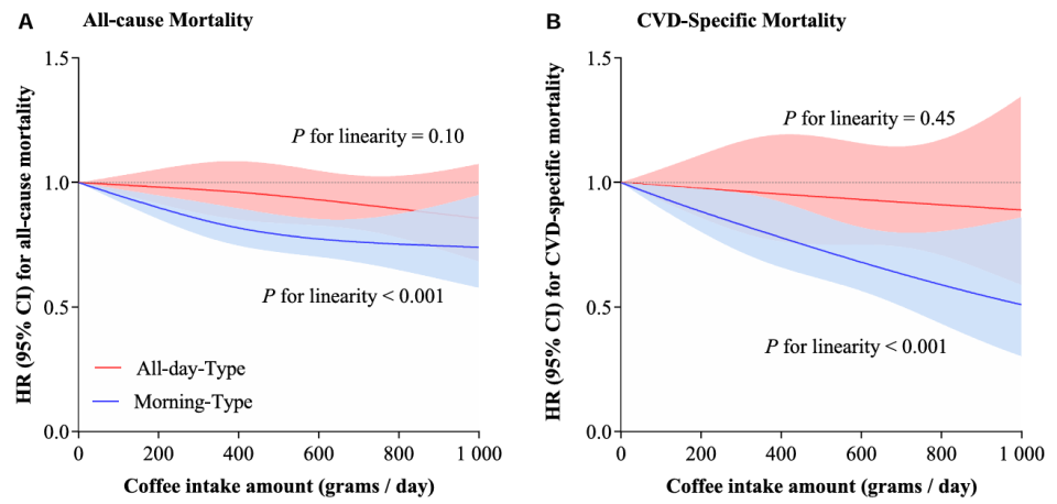 与不喝咖啡的人相比,“早晨型”咖啡饮用者的全因死亡风险降低了16%(HR 0.84),心血管疾病死亡风险降低了31%(HR 0.69)。相比之下,“全天型”咖啡饮用者并未观察到这种显著的生存优势。
