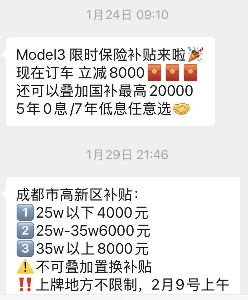 由于此前探访过程中与特斯拉某销售人员小L保持着联系,她也时不时给我发来相关的促销信息,包括金融优惠、限时补贴等等。