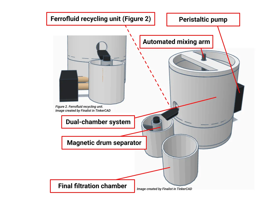 来自美国弗吉尼亚州凯特尔朗高中的学生米娅・海勒(Mia Heller)设计了一种采用磁流体(Ferrofluid)作为吸附介质的过滤系统,适合家庭终端净水终端,并具备低成本、可循环、无耗材以及易维护的优势。