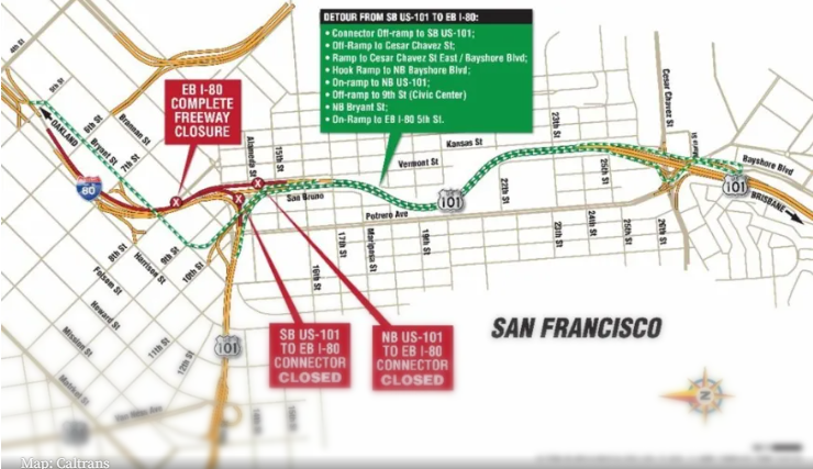 加州交通局指出,当周末期间,通往101号高速公路Bayshore Freeway的南向和北向连接匝道也将关闭。在关闭期间,I-80高速公路的最后一个东向出口为Vermont Street。